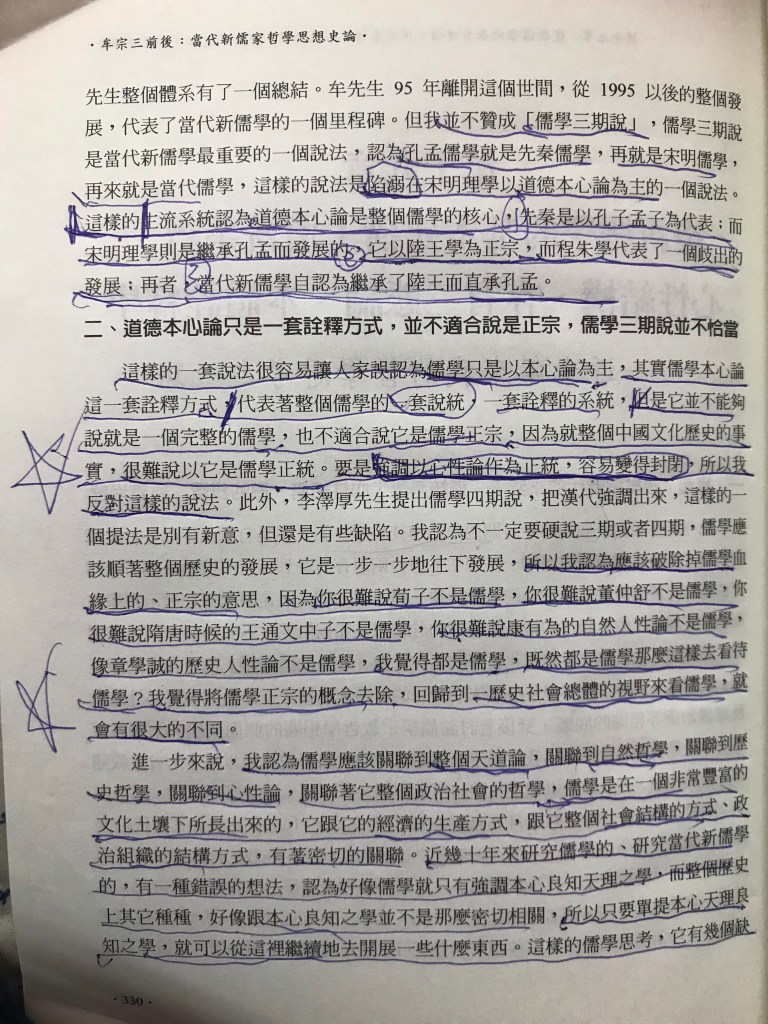 「、、主流系統認為道德本心論是整個儒學的核心,先秦是以孔子孟子為代表,而宋明理學則是繼承孔孟而發展的,它以陸王學為正宗,而程朱學代表了一個歧出的發展;再者,當代新儒學自認為繼承了陸王而直承孔孟。、、但是它並不能夠說就是一個完整的儒學,也不適合説它是儒學正宗。因為整個中國文化歷史的事實,很難説它是儒學正統,要求是強調以心性論作為正統,容易變得封閉,所以我反對這樣的說法。、、所以我認為應該破除掉儒學血緣上的、正宗的意思。因為你很難説荀子、董仲舒、王通、文中子、康有為、章學誠不是儒學,我覺得都是儒學、、我覺得儒學正宗的概念去除,回歸到一歷史社會總體的視野來看儒學,就會有很大的不同、、進一步來説,我認為儒學關聯到整個天道論、自然哲學、歷史哲學、關聯到心性論、關聯到整個政治社會的哲學。儒學是在一個非常豐富的文化土壤下所長出來的,它跟它的經濟的生產方式,跟它整個社會結構的方式、政治組織的結構方式,有著密切的關聯⋯⋯」(P.330)