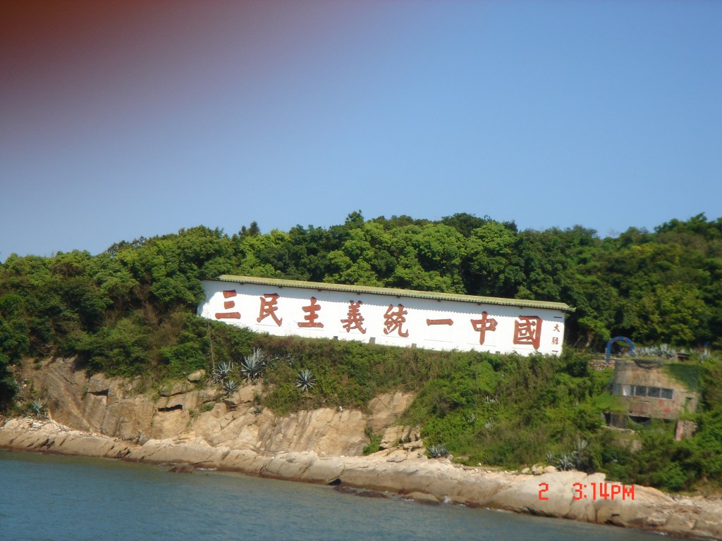 起錨的汽笛一響,廈門的身影就逐漸模糊。不久,映入眼簾的是位於大膽島上斗大的招牌,上書「三民主義統一中國」八個大字,有趣的是在這八個大字的正前方,位於廈門環島路上,也同樣出現八個大字的大招牌,內容為「一國兩制統一中國」。兩塊招牌遙遙相望,互相監視,蔚為奇觀。