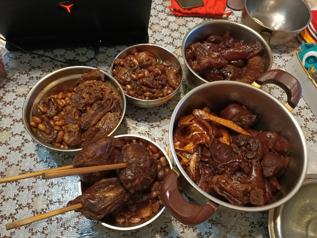 每個舊曆新年,老婆買了一堆牛、豬、豆類製品、…香菇、花生…,我搭配蘋果、洋蔥、胡蘿蔔、蕃茄等蔬果,這次又加了蓮霧,有酒(米酒、威士忌)、可樂、醬油,當然還有老婆絲襪中裝了亨利我特殊處方的滷包…,就開始第一鍋的快鍋:可樂豬腳+豬耳朵,旁邊一邊在川燙牛筋、牛肚。