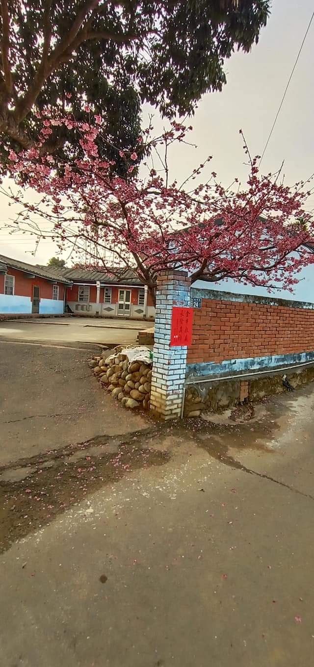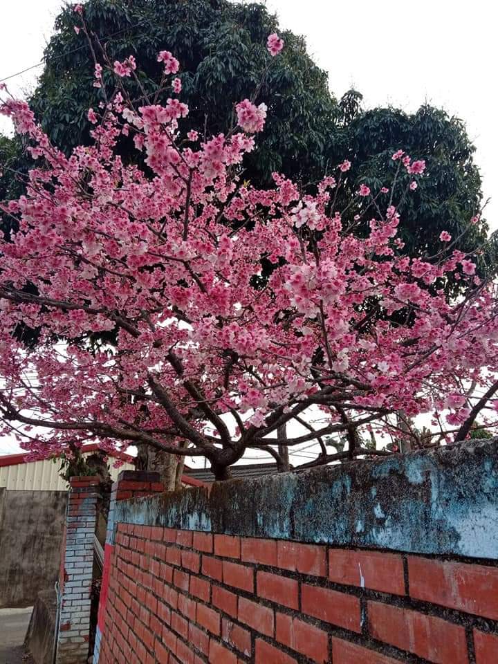 在當地一處村莊,鹿鳴巷24之1號大門口三合院大門口右邊靠牆,邂逅一株寒櫻花,突出牆外,紅白相間,鬥色爭妍,競相逞美,樹型極至優美,令人駐足久久不忍離去。