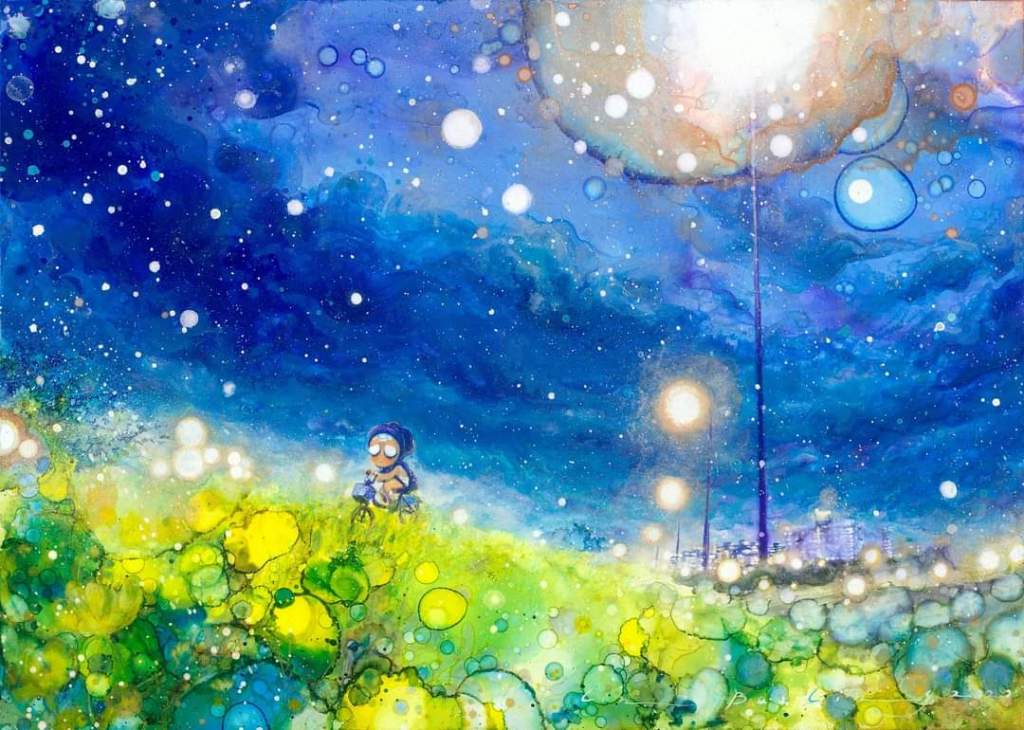 林葆靈,《夜騎》 壓克力、酒精墨水與閃光膠於合成紙, 29.7 x 42 公分, 2020