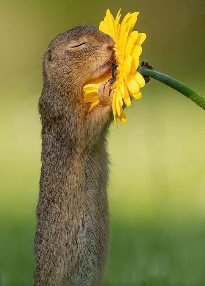 說明:維也納野生動物攝影師迪克(Dick van Duijn),捕捉到難得的畫面。一隻松鼠靠近一朵金黃色的雛菊,牠雙手捧著花將鼻子湊近,閉眼忘情的聞著花香,那副陶醉又滿足的神情,神似有靈性的人類對於珍愛之物所展現的愛戀情懷。