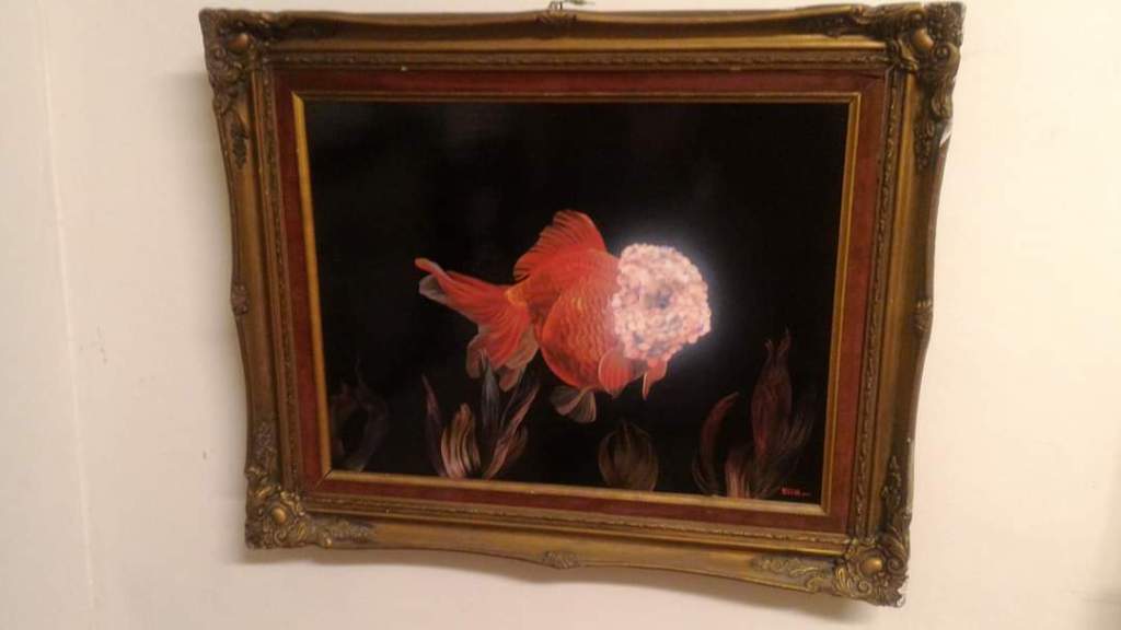 此畫作中金魚閃閃發亮的(乳)頭部,倒讓我感覺牠像是水中的自由女神,哺育眾小魚群之自由乳汁。