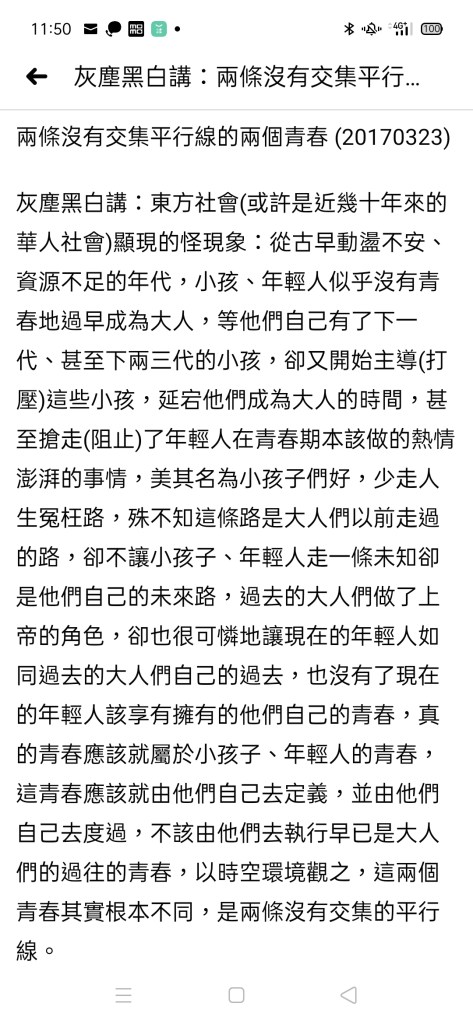 東方社會(或許是近幾十年來的華人社會)顯現的怪現象:從古早動盪不安、資源不足的年代,小孩、年輕人似乎沒有青春地過早成為大人,等他們自己有了下一代、甚至下兩三代的小孩,卻又開始主導(打壓)這些小孩,延宕他們成為大人的時間,甚至搶走(阻止)了年輕人在青春期本該做的熱情澎湃的事情,美其名為小孩子們好,少走人生冤枉路,殊不知這條路是大人們以前走過的路,過去的大人們做了上帝的角色,卻也很可憐地讓現在的年輕人如同過去的大人們自己的過去,也沒有了現在的年輕人該享有擁有的他們自己的青春,真的青春應該由他們自己去定義,並由他們自己去度過,不該由他們去執行早已是大人們的過往青春,以時空環境觀之,這兩個青春其實根本不同,是兩條沒有交集的平行線。 😢🥺😢