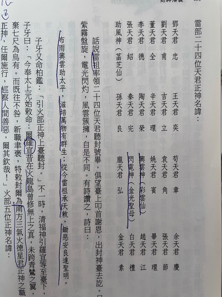 正巧,翻讀「封神榜」。姜子牙在封神台,封兵敗死於絕龍嶺的聞太師(忠臣、能人聞仲)為「九天應元雷聲普化天尊」(雷部正神、雷祖)帥24天君「布雨興雲助太平,滋培萬物有群生;從今雷祖承天敕,除惡安良達聖明」。這24位天官姓名如下照片:包括興雲神(彩雲仙)、閃電神(金光聖母)、助風神(菡芝仙):