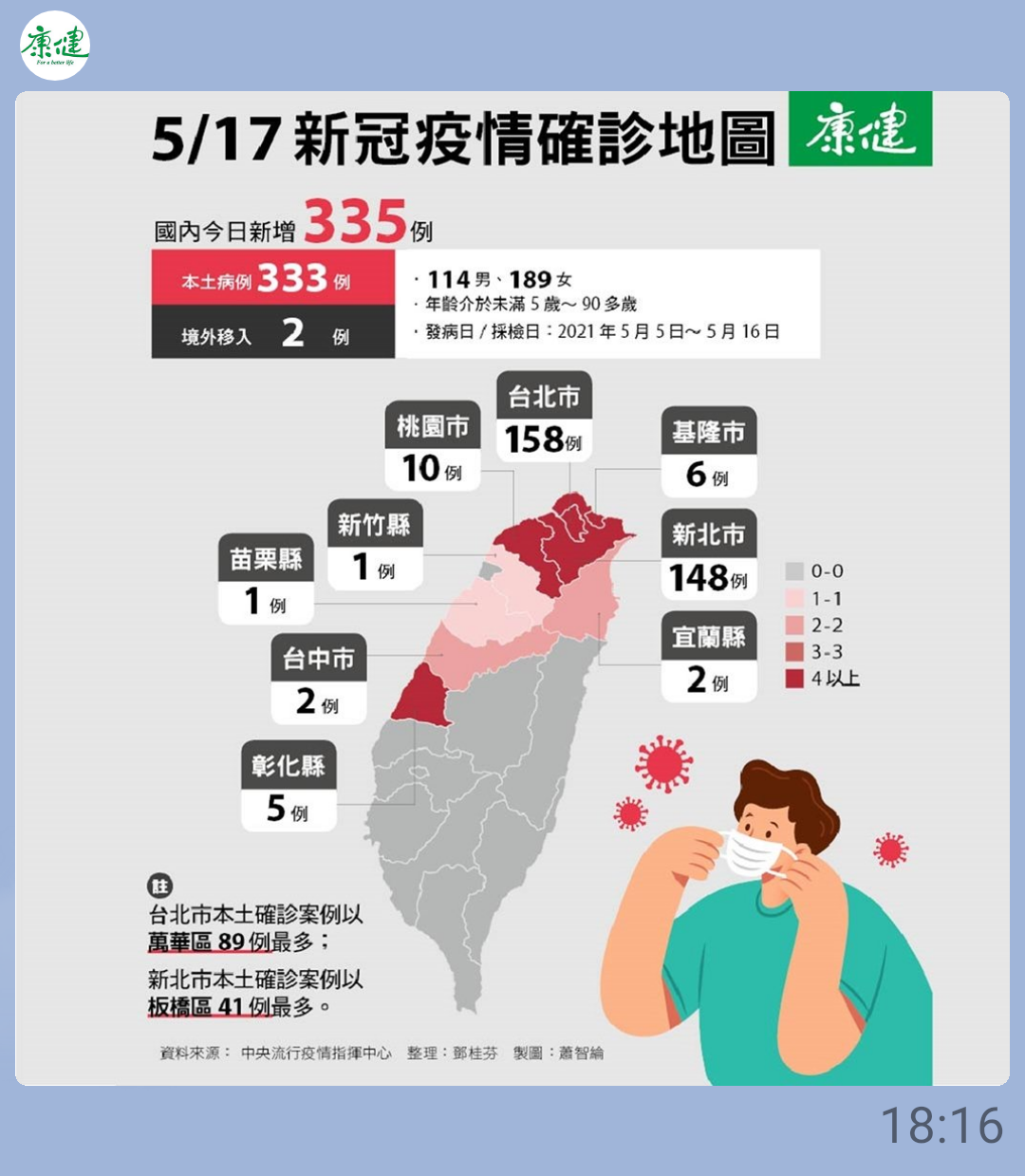 計畫趕不上變化,台北市、新北市疫情嚴峻,雙北市長5/17早上宣布高中以下學校停課至5/28,下午中央流行疫情中心宣布新增本土病例333例,2例境外移入。其中台北市158例,新北市148例,桃園市10例,基隆市6例,彰化縣5例,台中市、宜蘭縣各2例,新竹縣、苗栗縣各1例。各縣市確認人數分佈圖如照片1。從5月4日起到5月17日為止,本土病例人數的前後2週共14天合計增加789人,平均本土病例每天約出現56例。