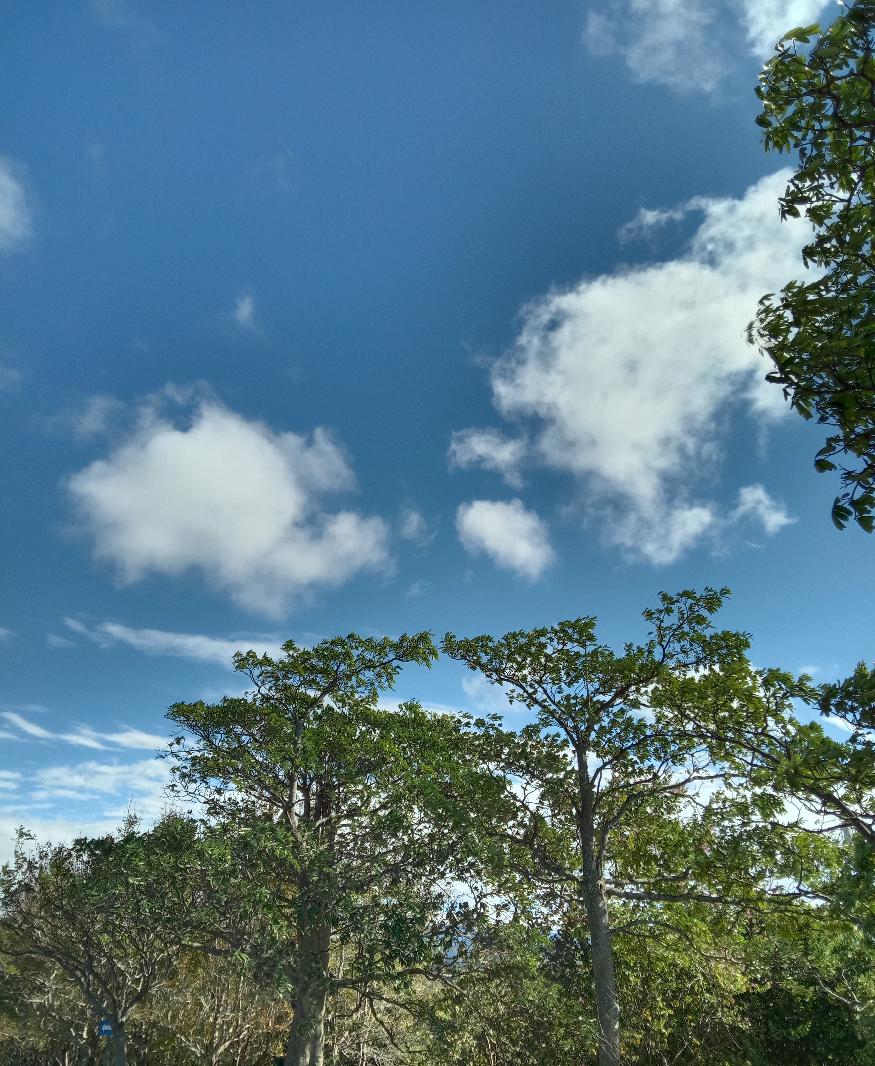 橋的另一端,是一片遼闊的濕地公園。園裡有幾棵成排的鳳凰樹,雖然已過了六、七月花團錦簇的盛開時節,仍然在樹梢上殘留著不少紅艷花朵,這是公園裡唯一的紅。前些天,幾陣風雨侵凌,枝椏花葉被壓的很低,舉手觸摸,感受到些許冷冽。放眼樹下,但見花葉飄零,滿地嫣紅,兼夾殘葉。不知那來的靈感,隨口吟出「秋雨壓枝下,落花堆塚高。何曾惜一葉,風浪似狼嚎。」的詩句,應當是五絕吧。
