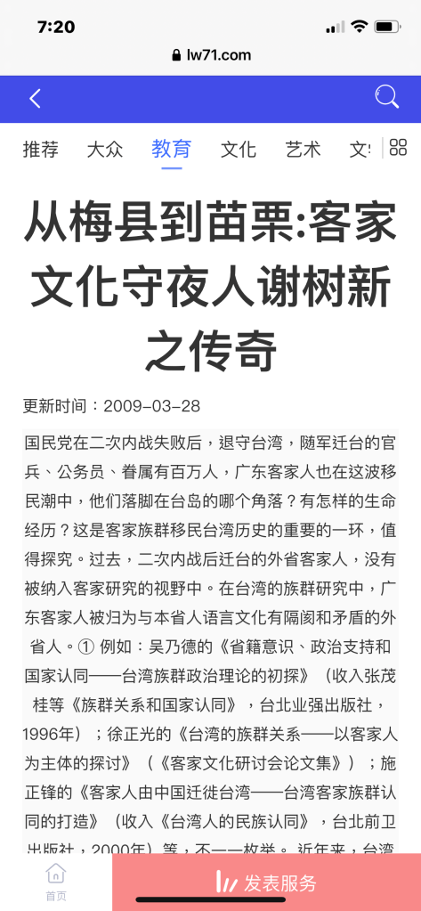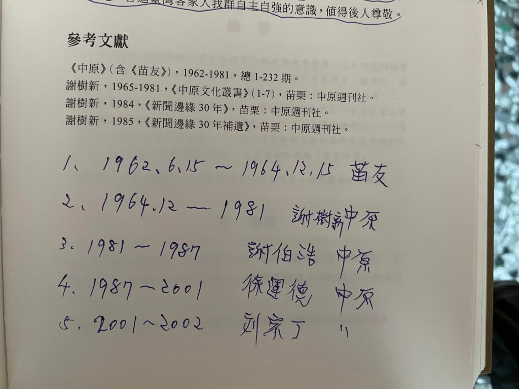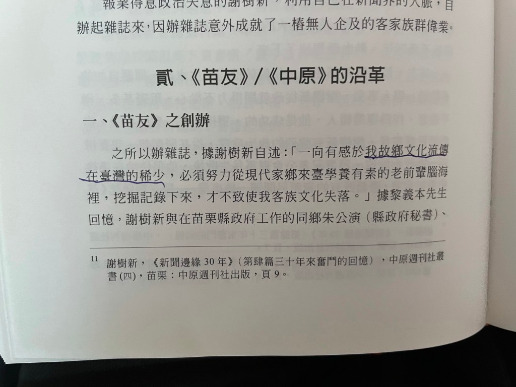 讀邱榮舉主編書「乙未1895」一書中有一篇關於謝樹新主編「中原月刊」(含「苖友),云謝樹新在苖栗經營「中華日報」業務、記者30年並以私人力量獨立辦「苖友」雜誌31個月及「中原」雜誌17年又其子謝伯浩其友徐運德、劉家丁繼續20年,合計40年出刊的故事,令人感動。 一個「文人」在動盪一生(又非財團),在一個小地方,能夠有這樣的意志與生命力,真是不簡單。