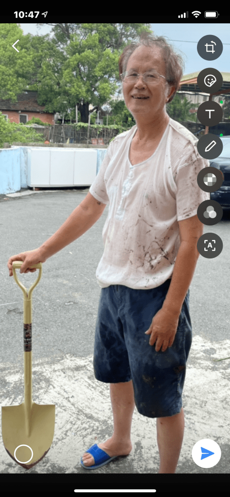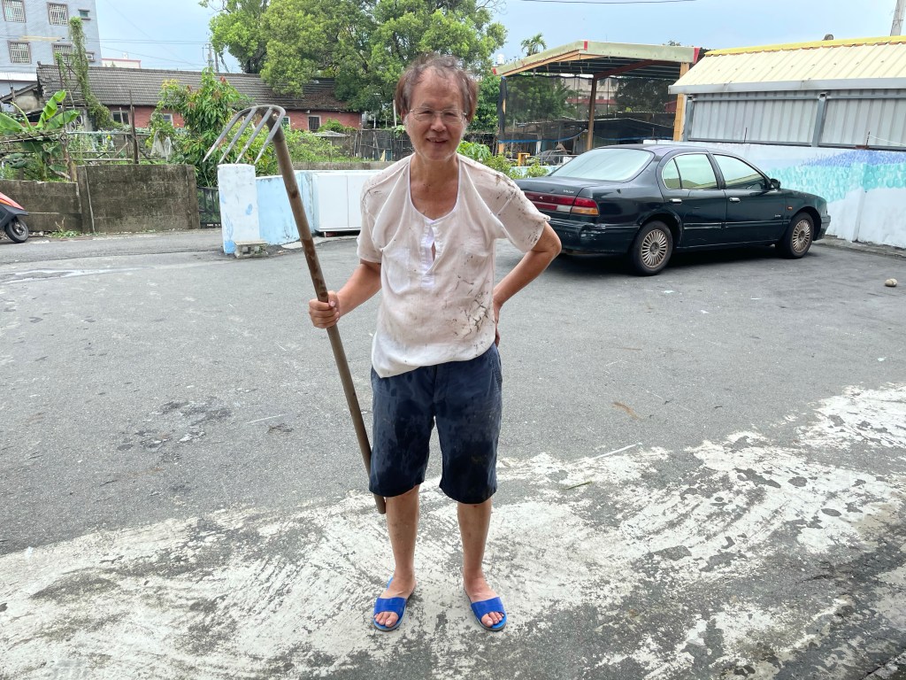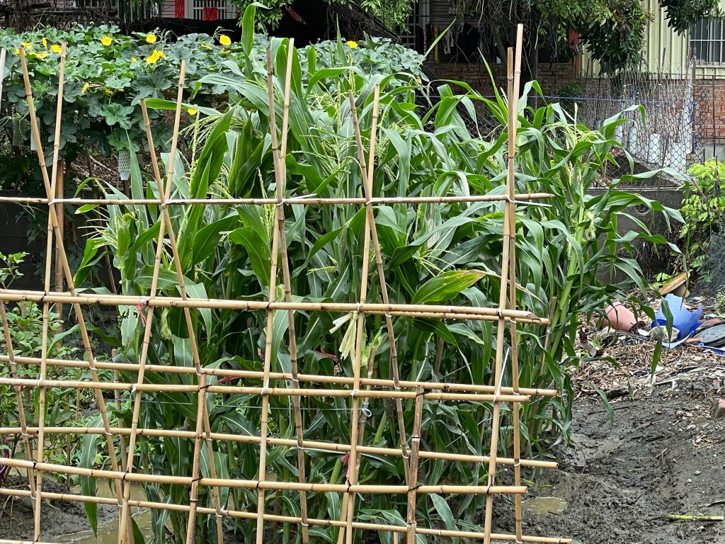 2021年五月30日大雨後,倒了一片玉米,31日晨我下泥土把玉米扶正、釘上竹柱、把玉米綁、架起來,希望它們能活下去,下個月長出玉米。在泥濘的土地玉米中混戰,沾了一身玉米葉子上的泥巴。