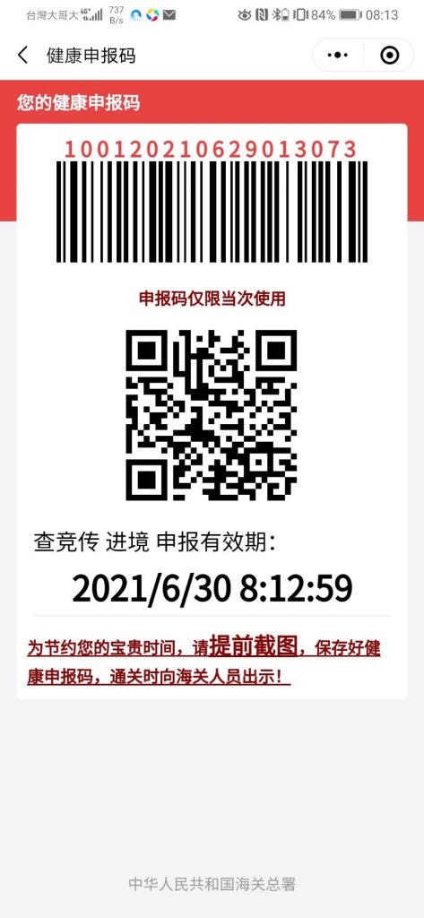 北京的入境手续始于桃园机场。在办理登机牌之前就要先扫描二维码,24小时有效,如附:
