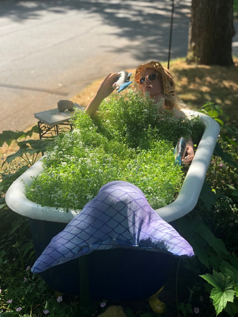 遠遠的看見路樹下深藍色的舊式浴缸, 心想大概有人裝潢遺棄的. 開近些, 我忍不住停下車, 走向這可愛的風景. 躺在浴缸的假美人吹著手上的泡泡, 浴缸內種滿大小白花, 花氣襲人, 錯落有致, 如沐浴泡泡朵朵開在浴缸裏潔白夢幻. 旁邊的落地燈垂著水晶的串珠, 在陽光下閃爍, 另一邊放了個小枱子, 一本書, 三兩個貝殼, 一小杯酒, 盎然春意不分四季駐足在這兒, 因為主人的巧思.