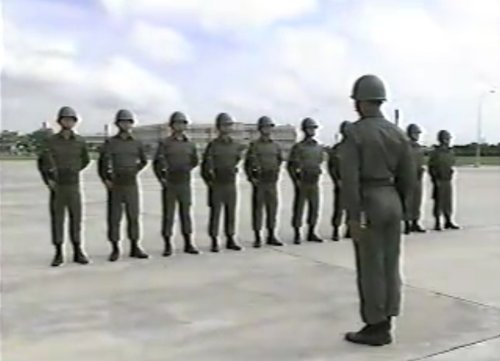 某天,連隊基本教練課。當排長喊出「立正!」口令時,口中開始唸出立正動作要領:「聞口令,兩腳跟靠攏併齊,腳尖向外分開45度(以兩腳掌內緣計算),兩腿挺直,兩膝靠攏。上體正直微向前傾,體重平均落於腳跟及腳掌上。