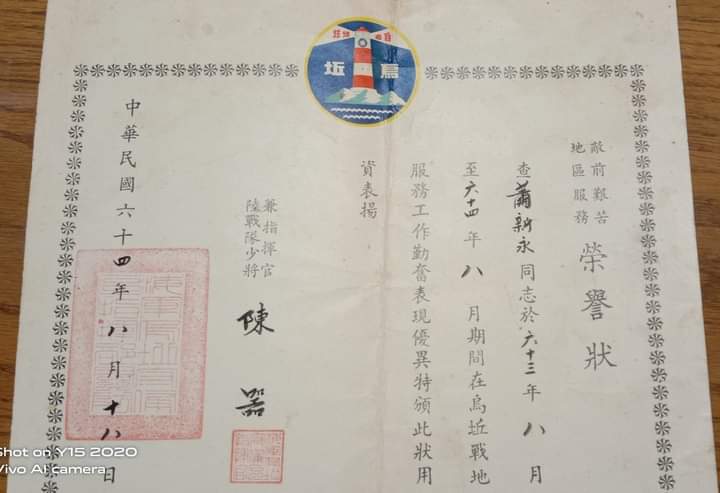 最近整理資料,跑出這張特別的證書,聽說拿這張代表著有前線服役的證明,還可以換金門高梁。