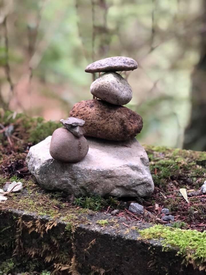 從堆砌的石頭, 可以約莫估計出主人的年紀. 沿路多是簡單的堆疊, 以為是孩子好玩來著. 今天, 在林子裏巧遇堆石的主人, 正專注於手中石頭的擺放. 花白的短髮下是張滿經風霜的女人臉龐, 或是自娛, 或是入山林的打卡方式, 或是我也猜不著的動機, 感覺是個有故事的長者. 由於我的腳步聲打斷了她的專心, 四目相交之際, 她接受了我的讚美, 回給我一個像孩子般的笑容, 滿足又開心.