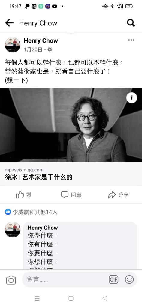 好友XX慧真厲害,找到了我貼的這文… 基本上,我是嗆徐冰,我就不認為有誰是偶像或神人,就 Be your own self 而已。