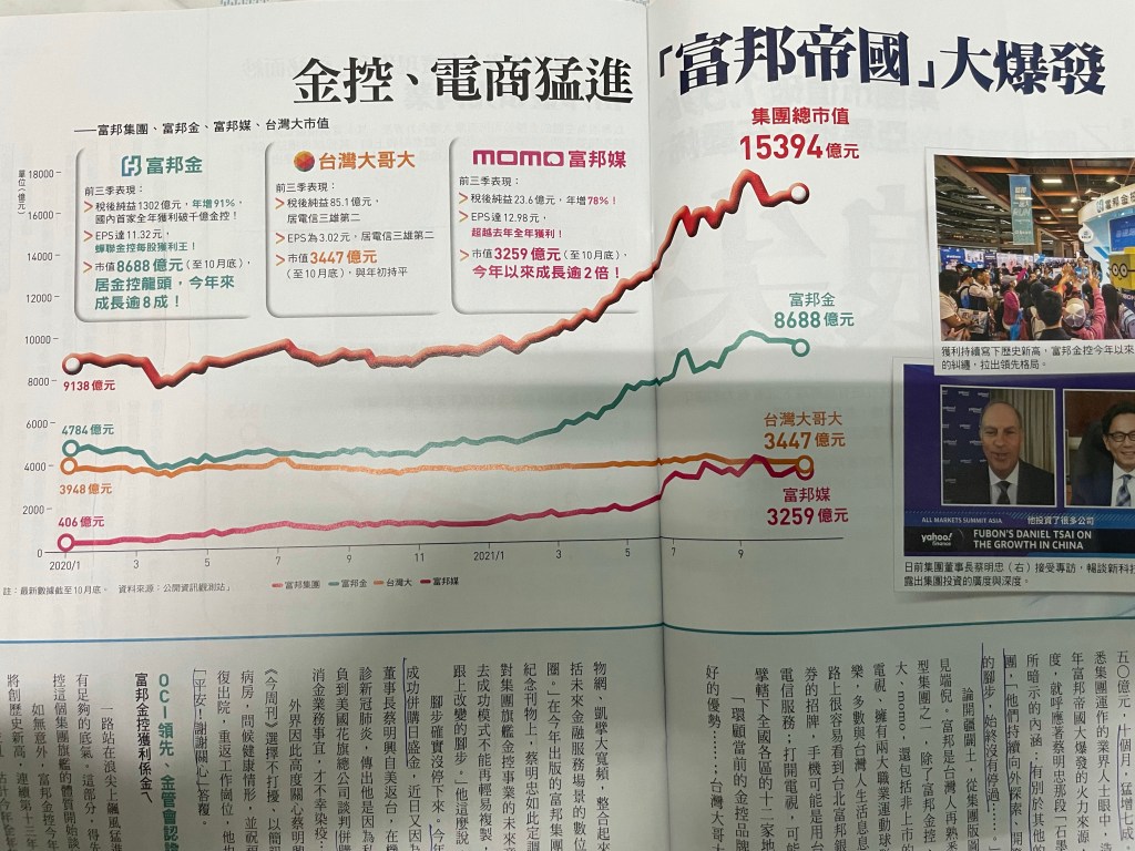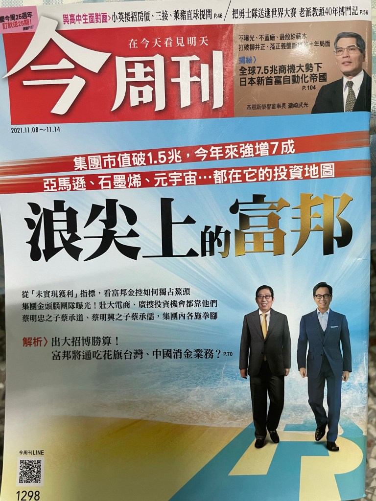 這幾天閱讀「今周刊」1298期(2021/11/8-14),我被周刊的封面「浪尖上的富邦」吸引了,詳細閲讀。該專題大意略為:1、富邦金至十月底獲利1358億,每股EPS 11.81元,較國泰金的1279億、每股9.39元為多;2、富邦金的「未實現穫利」(其他綜合損益)222億元,也比其他金控為「負的」為優。3、更重要的,蔡明忠對「元宇宙」、石墨烯等等新事務受訪時能侃侃而談,今周刊認為顕然已下過工夫,這位台大法律系畢業的經營者,是蔡英文的同班同學,表現不俗。