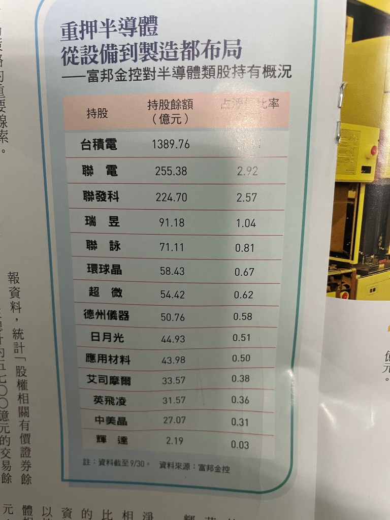 4、富邦金投資重押半導體,包括台積電、聯電、聯發科、瑞昱、聯詠、環球晶、超微、德儀、日月光、應用材料、艾斯摩爾、英飛凌、中美晶、輝達等12家,在第三季底的縂計約5700億元中,對半導體的投資高達百分之42。至第三季底對台積電仍有1389億元。5、整個集團依序投入台灣大哥大,由 2 G 、3G 到5G,不斷學習科技新知及交互應用;更創立Momo 電商,成長怏,至十月EPS達12.98元,市值3259億元。6.對新變化反應快速,因為大陸的政經大變,對阿里巴巴的投資至九月底已經在申請的資料中消失,對騰訉的投資已減半,約只剩1.1億。比同業快速反應。
