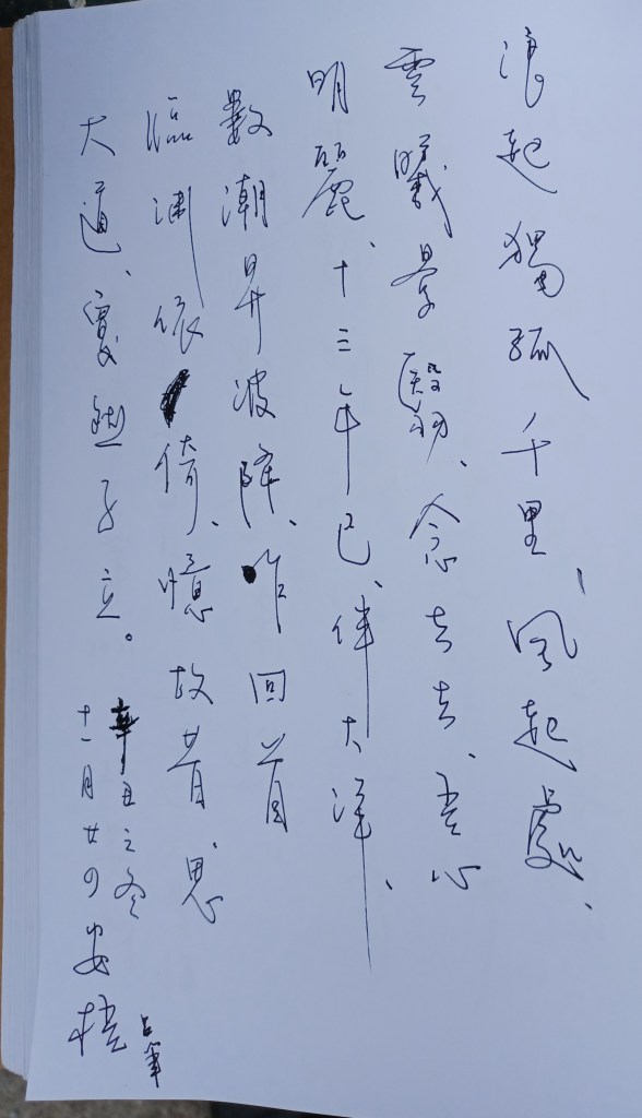 浪起獨孤千里。風冷處。雲曦景翳。念去去。吾心明麗。十三年已。伴大洋。數潮昇波降。乍回首。臨淵依倚。憶故昔。思大道。夐然孑立。