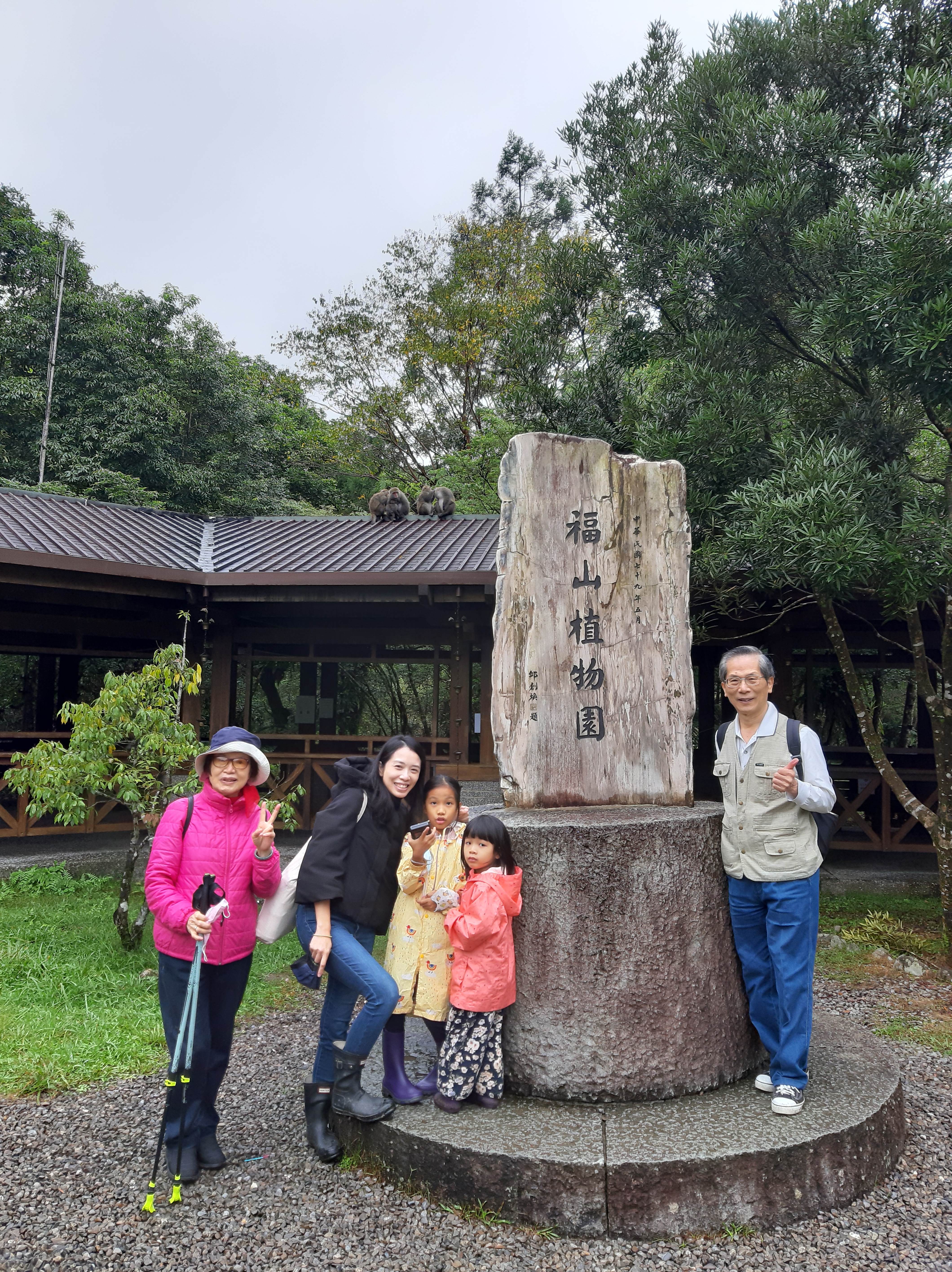 2021年11月8日上午從台北開車經雪山隧道前往宜蘭員山鄉,中午至【福山植物園】健行,沿著森林步道拍攝山羌、山羊、紅腳鴦、藍腹鳥、獼猴等動物,並在養生池、福山植物園門口合照如照片1。11月9日早上7:30在Austin飯店早餐Buffet ,餐後小朋友去遊戲室玩,大人則去泡湯,中午至員山市區吃【阿媽給的】蒜味肉羹,餐後再開車回台北。