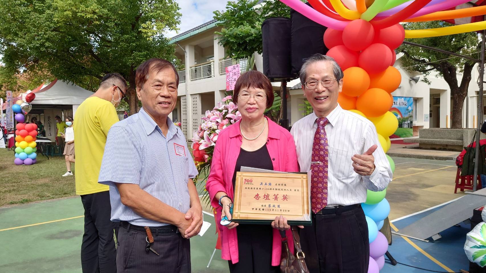 11月19日適逢農曆10月15日,搭高鐵回草屯老家,中午在老家二樓神明廳祭拜母親靈位,下午與幾位同鄉好友相約在南投【文心園】喝咖啡敘敘舊, 並參觀南投張氏望族綰溪宗祠如照片4。20日參加南投市【營盤國民小學】100週年校慶典禮,如照片5。內人自台北女師畢業分發在營盤國小服務,蔡校長邀請內人返校觀禮,並頒發對教育有功人員獎牌以茲留念。