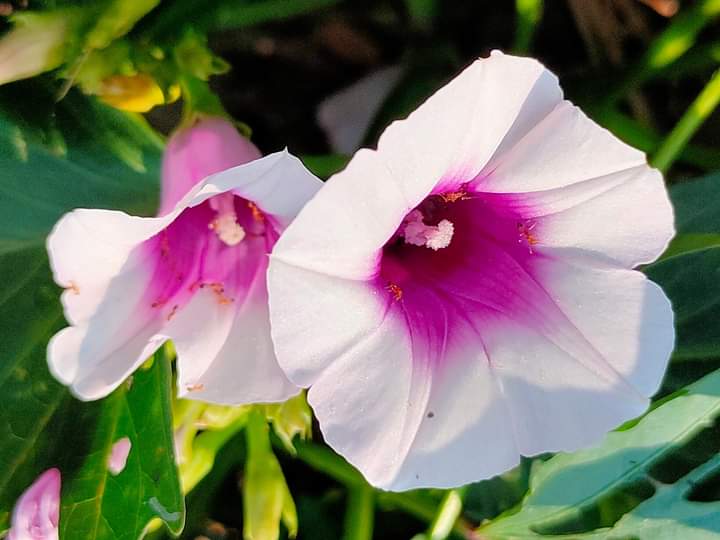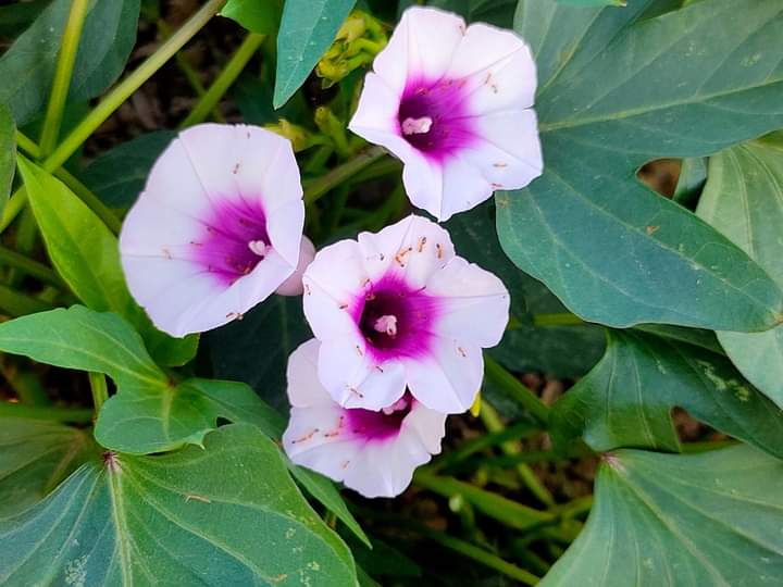 逐年的寒天,蕃薯會開足媠足濟的花蕊,親像牽牛花模樣,花蕊的長度量其約佇3~5cm附近。花瓣是茄仔色,接近紅色的色緻,毋過花瓣頂面四箍圍仔是白色,親像一个田莊媠查某囡仔穿的蓬鬆的花裙,樸實閣袂虛華。