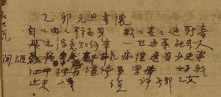 這首名為《乙卯元旦書懷》的漢詩正文應該是:「自自由由幸福身,歡歡喜喜過新春。平生得意知何事,一世無憂能幾人?閒陋幸無名士氣,癡愷還有少兒真。近來一事勘倚說,曾許無邪乙女親。」這是一首七律,平水韻十一真。