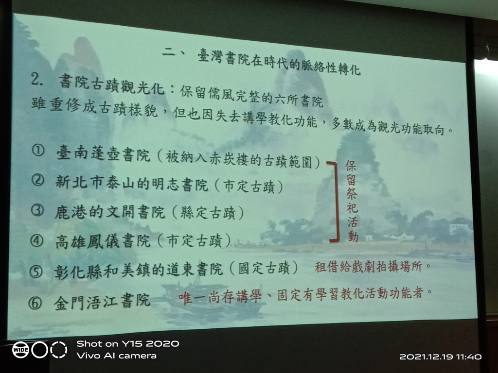 (七)張教授的結語,談到三點台灣書院的精神,有哲學文化的意味,我不完全清楚其學術內藏的意義,看來唯有期待《台灣書院的傳統與現代》大作出版,始能洞悉藴涵。