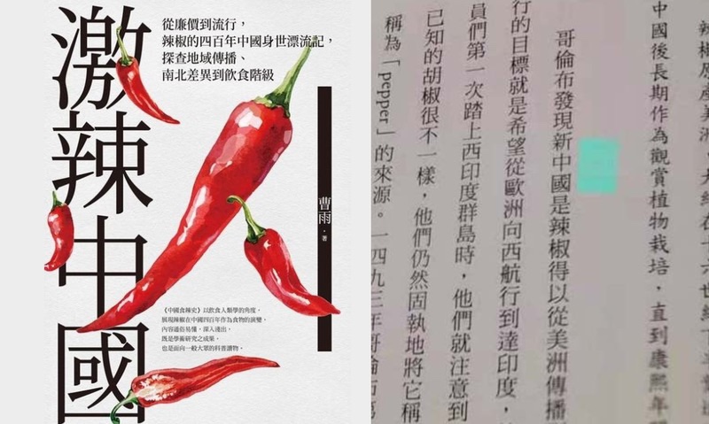 「激辣中國」是本介紹中國美食的書,書中所有出現「大陸」的字眼,全部被書中編輯以搜尋並全部取代(Word的功能)成「中國」,於是出現了哥倫布發現「新中國」,以及「歐亞中國」(原是歐亞大陸)等的低級錯誤。這裡面揭示了年輕世代對於全球歷史知識的匱乏,以致看不到問題所在,這是台灣新一代教育的悲哀。
