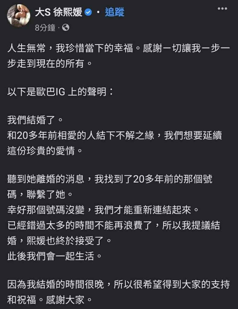 看了男方採訪,是真的很愛大S,等了20年很不容易。
