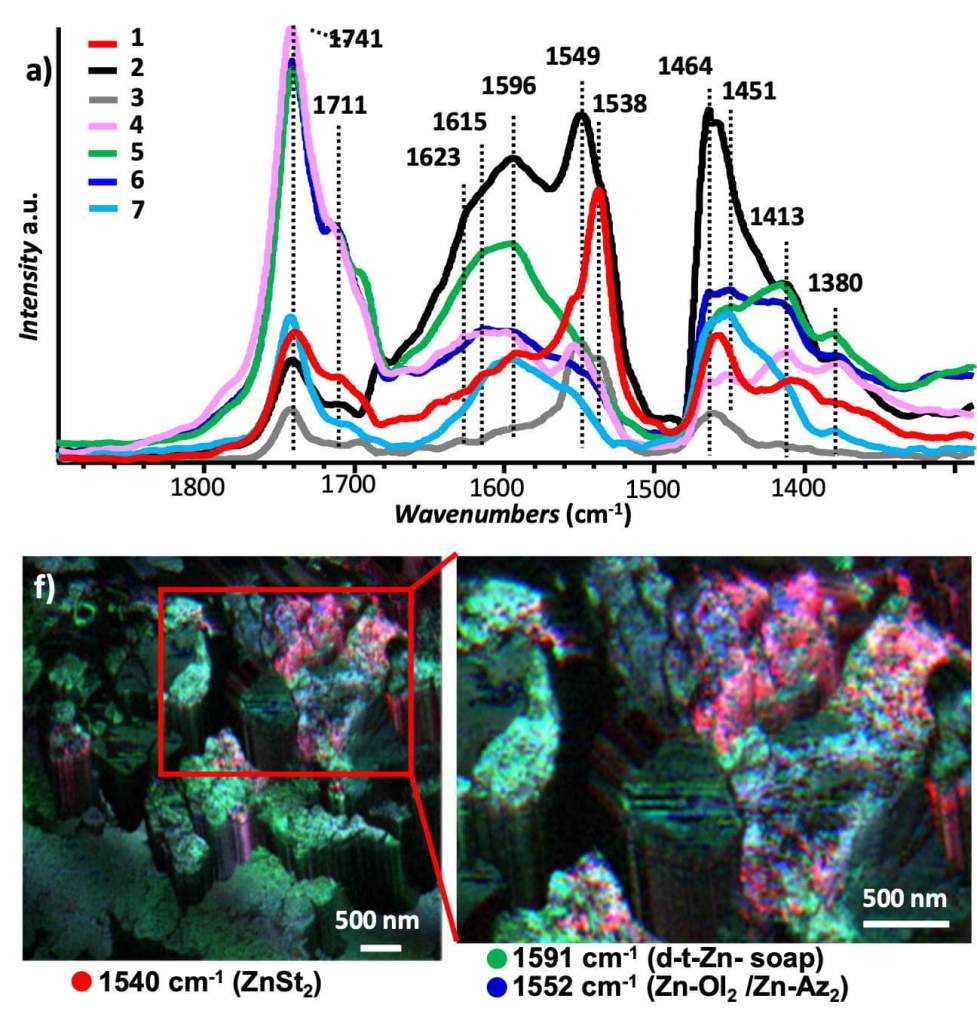 為了查看更細微的細節,研究人員使用了兩種依賴“巧技”來繞過通常的解析率限制的方法。在實驗室位於加州聖塔巴巴拉的光熱光譜公司(Photothermal Spectroscopy Corporation, https://www.photothermal.com/ ),他們使用了一種稱為光學光熱紅外光譜術(optical photothermal infrared spectroscopy, O-PTIR)的技術。在O-PTIR中,來自脈衝紅外光雷射和恆定綠光雷射的光都聚焦在樣品上。 紅外光脈衝重複不斷地以一系列不同的紅外光波長,來加熱樣品。加熱後的樣品反射一定量的綠光雷射光,這取決於它在每個波長吸收多少的紅外光。由於綠光雷射的波長(532奈米)遠小於紅外光波長,因此可以聚焦到更小的光點並有效地提供紅外光譜,從而詳細了解樣品的化學成分,解析率約為500奈米。Centrone 說:樣品吸收的波長就像指紋,可用於辨識特定的化合物。使用這種技術,研究人員發現樣品中存在多種鋅皂,但不含鉛皂。他們確定了特定種類的鋅皂,例如硬脂酸鋅(zinc stearate)和油酸鋅(zinc oleate),它們是緻密且有序的(結晶(crystalline))金屬皂,以及普遍無序的(無定形(amorphous))鋅皂。由於無定形鋅皂的無序結構,研究人員認為它允許水、離子和其他化合物的緩慢傳輸或擴散,然後它們可能會發生反應,隨著時間的推移致促進金屬皂群集的形成和成長。空間解析率仍然不夠好到足以看到這三種金屬皂在樣品中的分佈情形。為了深化他們的觀點,研究人員在馬里蘭州蓋瑟斯堡NIST的研究園區使用了一種稱為光熱引致共振(photothermal induced resonance, PTIR)的技術。在PTIR中,來自脈衝紅外光雷射(也具有一定波長範圍)的光加熱樣品,樣品在每個脈衝後迅速膨脹和收縮。樣品在原子力顯微鏡懸臂的尖端上脈動,導致懸臂開始像被敲擊的音叉一樣振動。研究人員量測了懸臂振動的程度,以確定樣品吸收了多少光。