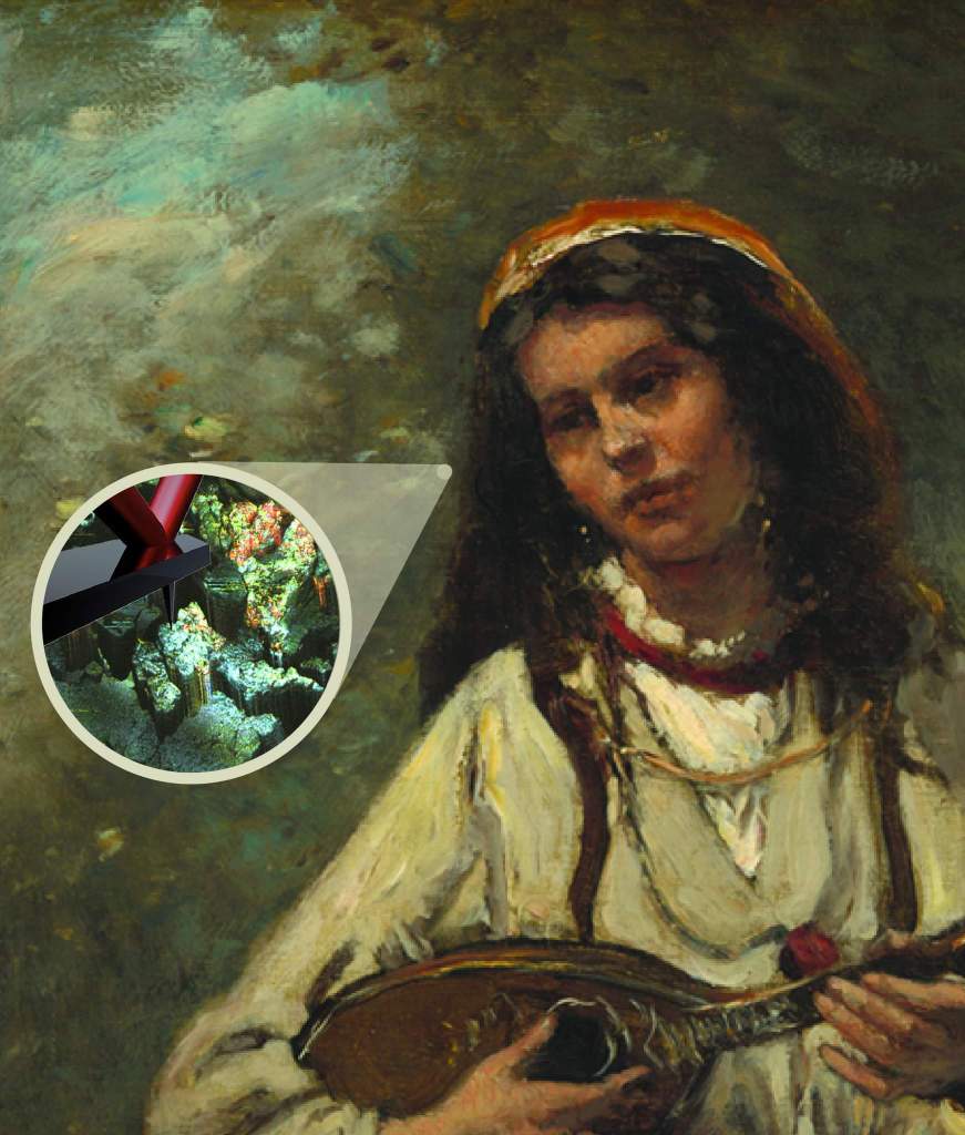 就像浴皂由脂肪酸分子與鈉離子結合組成一樣,金屬皂也是由脂肪酸分子組成,當油漆中的油與水和氧氣反應時形成,並與從顏料中浸出的金屬離子結合。含有鋅和鉛顏料的油漆經常形成金屬皂,而據報導許多其他含金屬的油彩(如鋁、鈣和錳)也能形成皂。在這項研究中,研究人員分析了藝術家尚-巴蒂斯·卡密爾·柯洛(Jean-Baptiste Camille Corot,1796年7月16日-1875年2月22日,法國著名的巴比松派畫家,也被譽為19世紀最出色的抒情風景畫家) 創作的一幅法國 19 世紀畫作《吉普賽女人與曼陀林(Gypsy Woman with Mandolin)》,該畫作收藏在華盛頓特區的美國國家藝廊。NIST 研究員 Andrea Centrone 說:這幅畫有一些藝術保護人員指出的問題。這畫作油彩有13層,許多是由於在繪畫完成後很久才進行的修復,至少頂層正在變質退化。他們想把這幅畫恢復到原來的樣子,並在微觀層面上找出這幅畫的頂層發生了什麼問題;這就是我們開始提供幫助的地方。為了盡量減少對這幅畫的損壞,研究人員使用手術刀從退化區域採集了一個小樣本。分析了頂層的組成分,他們很快確定油彩由乾油、鈷綠(cobalt green)和鉛白(lead white)顏料以及金屬皂組成。然後,他們使用三種獨立的紅外光技術對金屬皂進行了特徵分析,這些技術揭示了從微米到奈米尺度的細節。第一種方法稱為紅外光顯微術 (infrared microscopy),是一種成熟的技術,通常用於辨識樣品的化學成分,因為材料或分子吸收的紅外光的特定波長(顏色)相當於特定的辨識指紋。使用最先進的紅外顯微術,其空間解析率為百萬分之一米,可以辨識金屬皂的普遍存在,但不能辨識特定的各別類型。Centrone 說:光學顯微術的一個基本限制是光不能聚焦到小於其波長一半的點。紅外光的波長在2到20微米之間,雖然聽起來很小,但對於以奈米等級空間解析率的量測細節來說還是太大了。正如研究人員在他們的工作過程中所了解到的那樣,奈米等級空間解析率對於解析油料的原始成分及其變質副產物的如何混雜再一起至關重要,這對於更好地了解油料中的化學反應是必要的。
