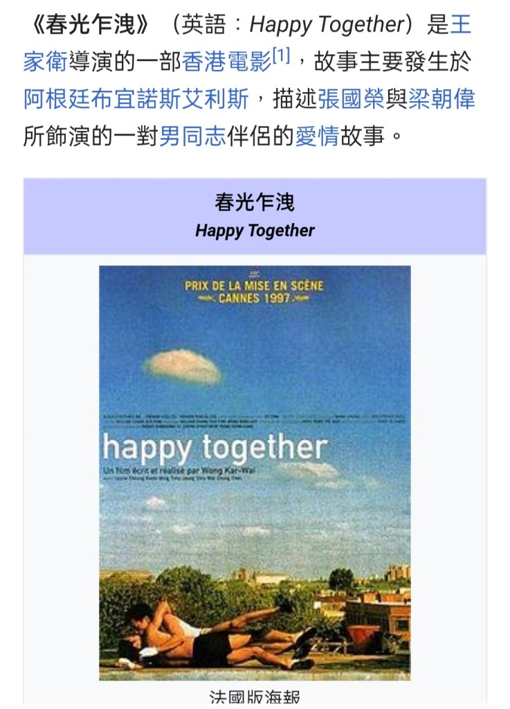 《春光乍洩》(英語:Happy Together)是王家衛導演的一部香港電影,故事主要發生於阿根廷布宜諾斯艾利斯,描述張國榮與梁朝偉所飾演的一對男同志伴侶的愛情故事。