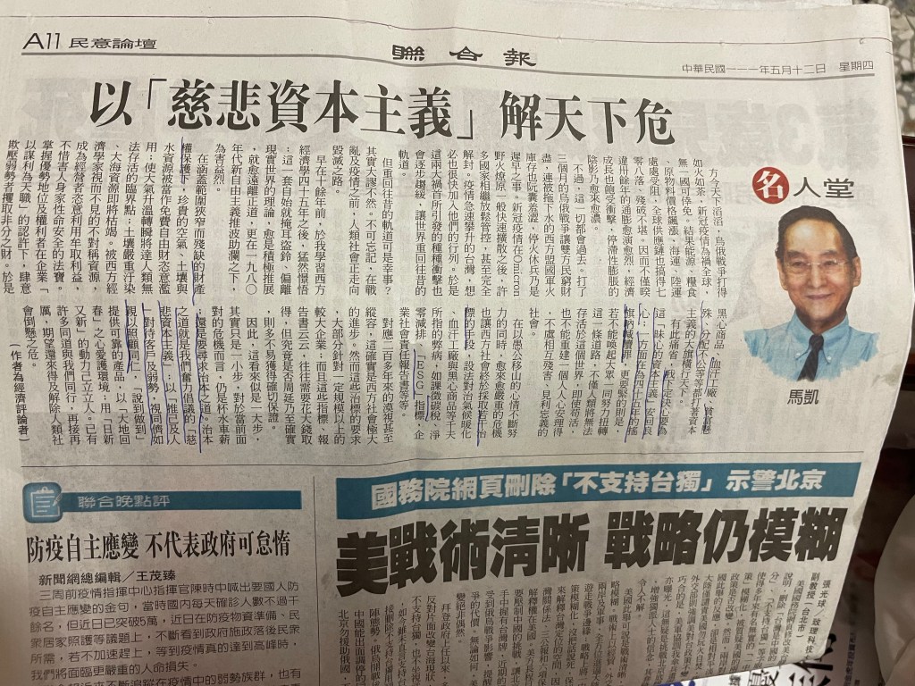 同日同報紙刊出「拜登打算降低關稅解決通膨問題」,足見前幾年美國對中國輸美產品高課關稅乃造成美國通膨之主因之一⋯⋯美國傷人七分也傷己三分。這世界真的需要「慈悲資本主義」、「慈悲民主政治」、「慈悲法治主義」,啊!少了慈悲,都有弊端。