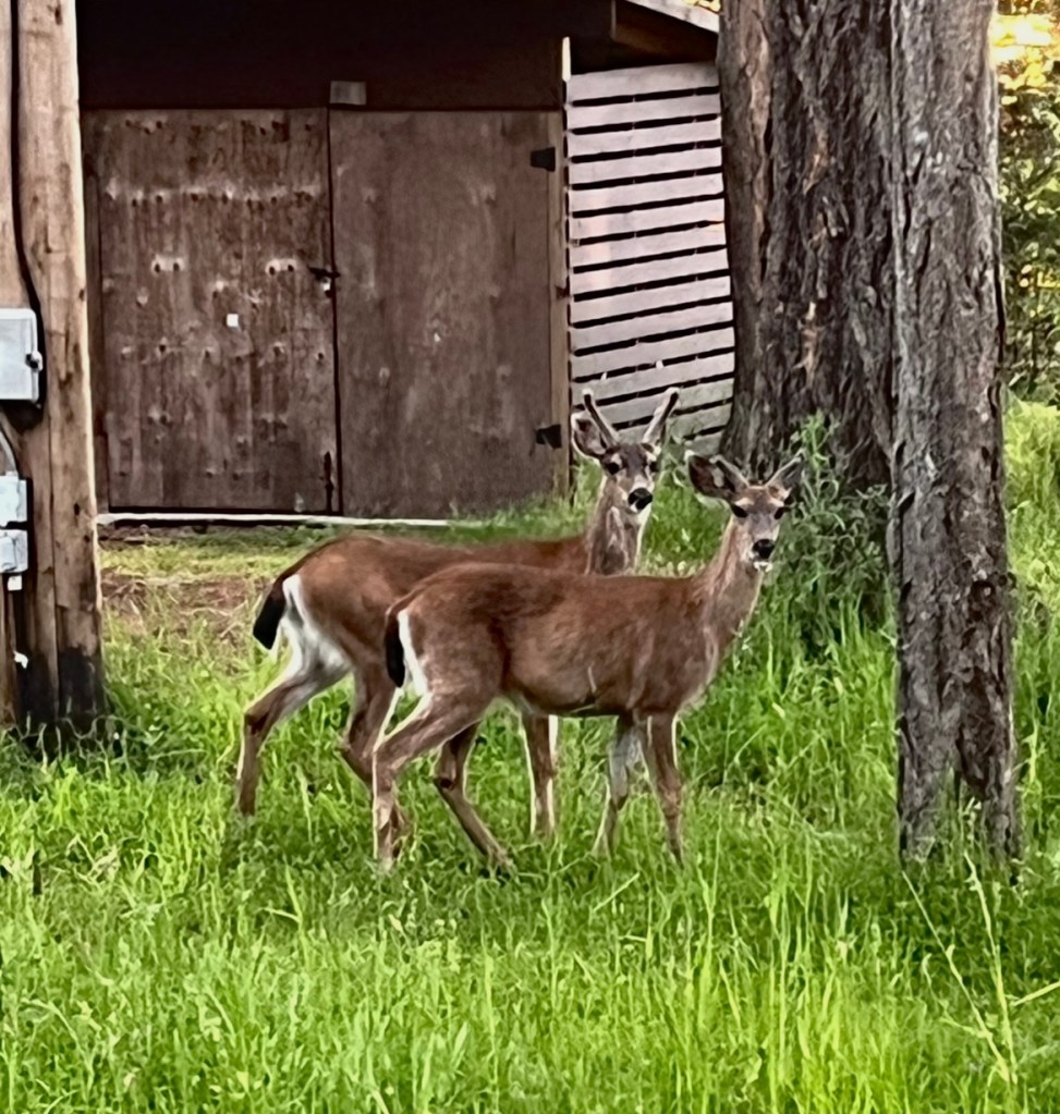 金碧輝煌的黃昏餘暉下牠們的身形都鑲著一圈金邊,得以看到其中一隻頭頂的鹿茸,可見是一公一母一塊兒散步,也是浪漫。突然其中一隻奔向我,這是我始料未及,本能反應轉身跑進屋子。回過神,想想牠們又不會咬人,我該學學白雪公主摸摸牠們,真是錯失良機。