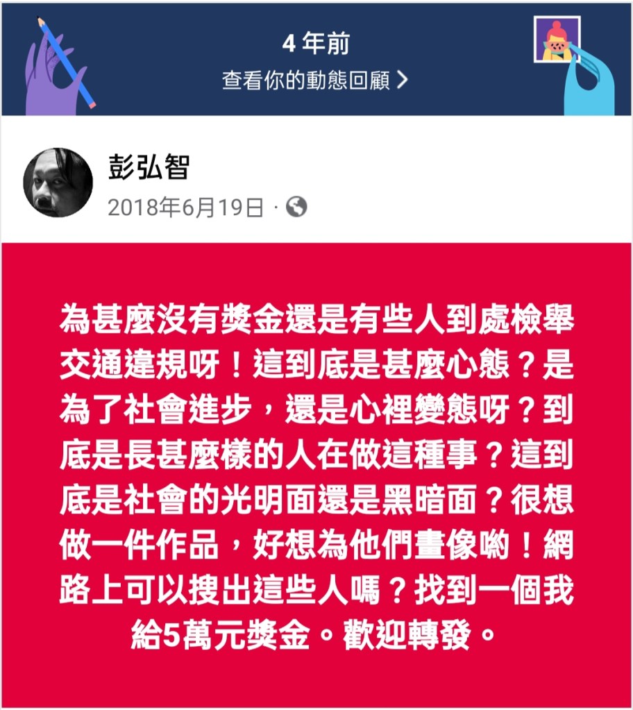same feeling as yours!!! (台灣的道路交通規則出發點在:對錯,在美國考駕照的首要黃金準則在:Courtesy,意即禮讓、禮節第一,意思是即便無政府官方制訂的交通規則可遵循,仍應以禮讓為第一準則) 這種變態檢舉交通違規之心態就是顯示台灣實際已到無禮儀之邦,根本就像一個白色恐怖主導的國家,人民之間均無信賴感,難怪人民與政府之間亦如是,殊不知政府執政的那一票人,不也是由人民所轉換身分而成,合理懷疑:我們的政府,不論哪一顏色政黨組成,怎會相信人民,甚至還把人民當賊來看,真的不可能有信賴感,繳出給政府的稅,也難怪有肉打包子之感!!!