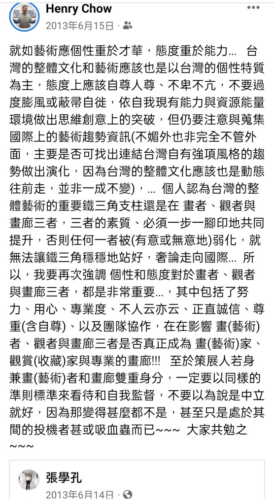 就如藝術應個性重於才華,態度重於能力… 台灣的整體文化和藝術應該也是以台灣的個性特質為主,態度上應該自尊人尊、不卑不亢,不要過度膨風或蔽帚自徙,依自我現有能力與資源能量環境做出思維創意上的突破,但仍要注意與蒐集國際上的藝術趨勢資訊(不媚外也非完全不管外面,主要是否可找出連結台灣自有強項風格的趨勢做出演化,因為台灣的整體文化應該也是動態往前走,並非一成不變),… 個人認為台灣的整體藝術的重要鐵三角支柱還是在 畫者、觀者與畫廊三者,三者的素質、必須一步一腳印地共同提升,否則任何一者被(有意或無意地)弱化,就無法讓鐵三角穩穩地站好,奢論走向國際… 所以,我要再次強調 個性和態度對於畫者、觀者與畫廊三者,都是非常重要…,其中包括了努力、用心、專業度、不人云亦云、正直誠信、尊重(含自尊)、以及團隊協作,在在影響 畫(藝術)者、觀者與畫廊三者是否真正成為 畫(藝術)家、觀賞(收藏)家與專業的畫廊!!! 至於策展人若身兼畫(藝術)者和畫廊雙重身分,一定要以同樣的準則標準來看待和自我監督,不要以為說是中立就好,因為那變得甚麼都不是,甚至只是處於其間的投機者甚或吸血蟲而已,大家共勉之。