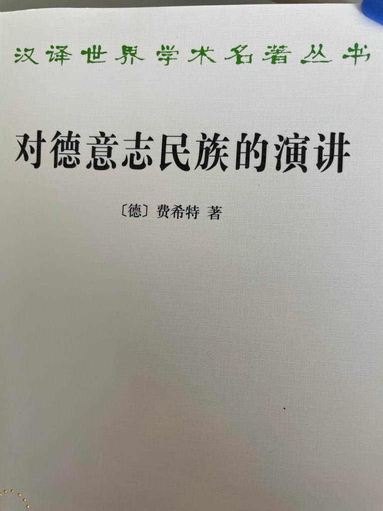 2、在德意志(以普魯士為主)被拿破崙擊敗及法國駐軍柏林、要求賠款之際,費希特痛定思痛,鼓舞德意志民族的信心,並主張以「教育」改造德意志的國民性,於1807-08 做了十四次演講「對德意志民族的演講」,技巧的批判法國拿破崙破壞革命的理想(理性的自由人的國度),那是「冒著生命危險的事」,有另一教授剛因言論被拿破崙在柏林的駐軍槍殺。這両天略讀「對德意志民族的演講」。