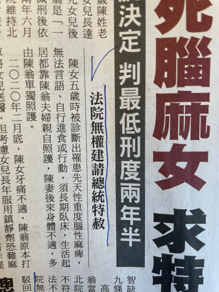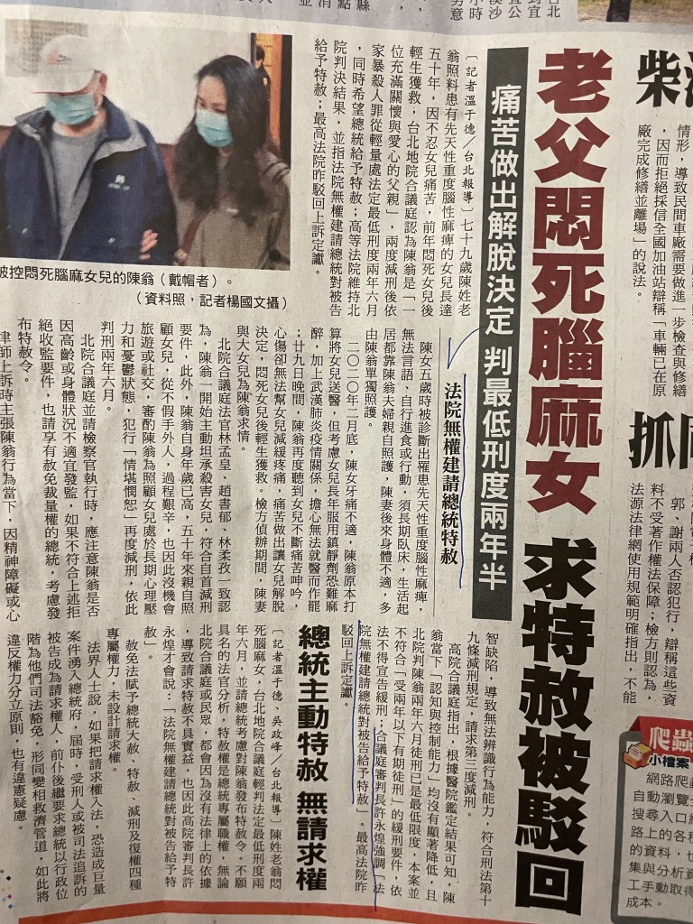 79 歲老父因不堪已經照顧五十年的腦性痲痺女兒在病痛折磨而做出予以解脫的行為,被法院判處最低的徒刑二年半。