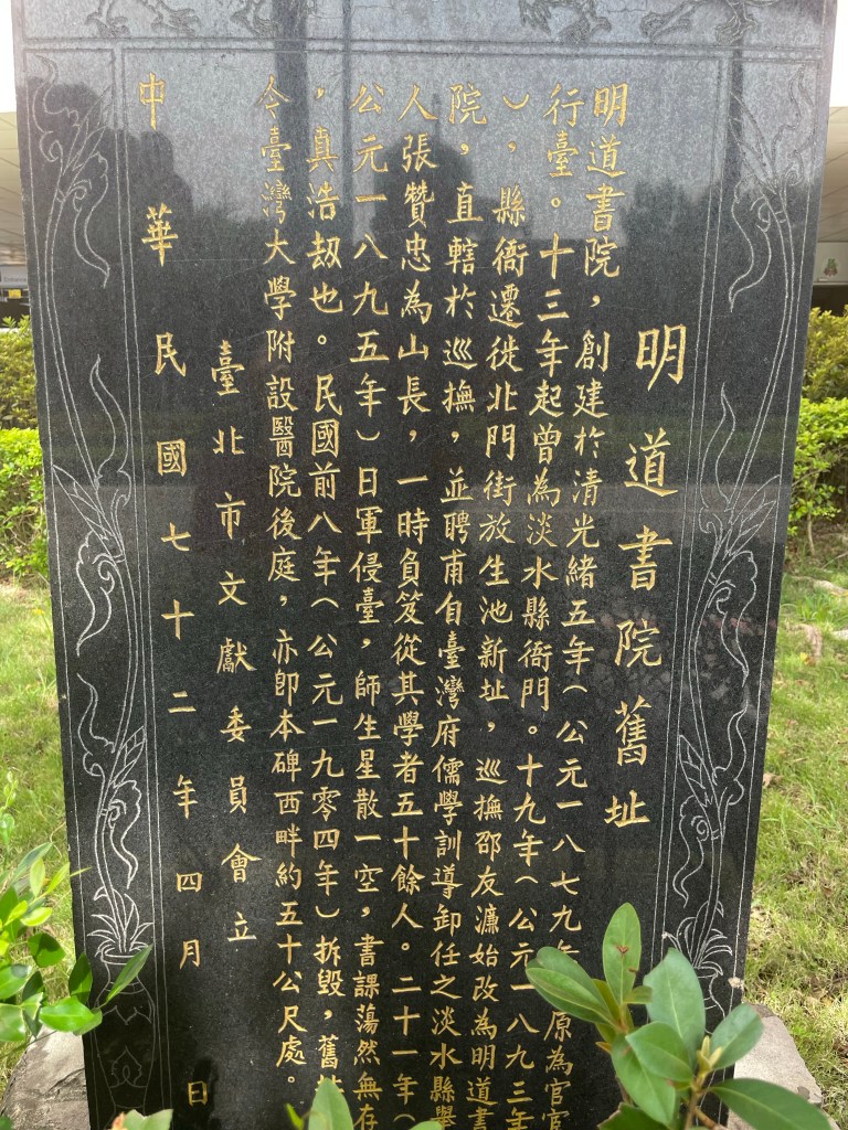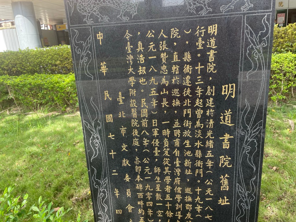 明道書院被拆的只剩下一塊碑,就在台大醫院路旁的中山南路上⋯⋯人們也不會注意到,我不小心看到了。我的同鄉淡水舉人張贊忠曾任山長。