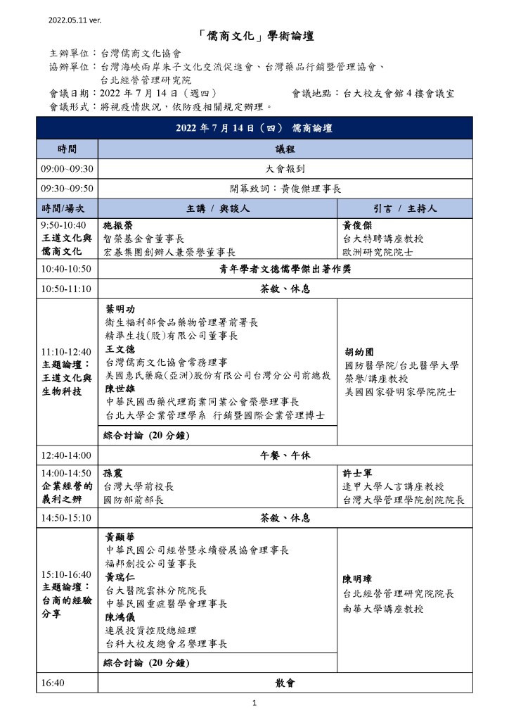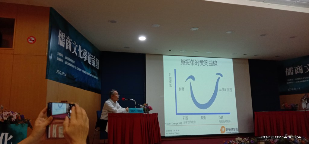 今天論壇的主題是王道文化。王道思維是主流,儒商之利義中求。從來貨殖非奸巧,正是利他霸道休。王道思維與文化、多維微笑曲線、儒商文化、利己利他利生、義利合一、君儒與小儒、台商機會與挑戰、醫院生存之道、醫病關懷。
