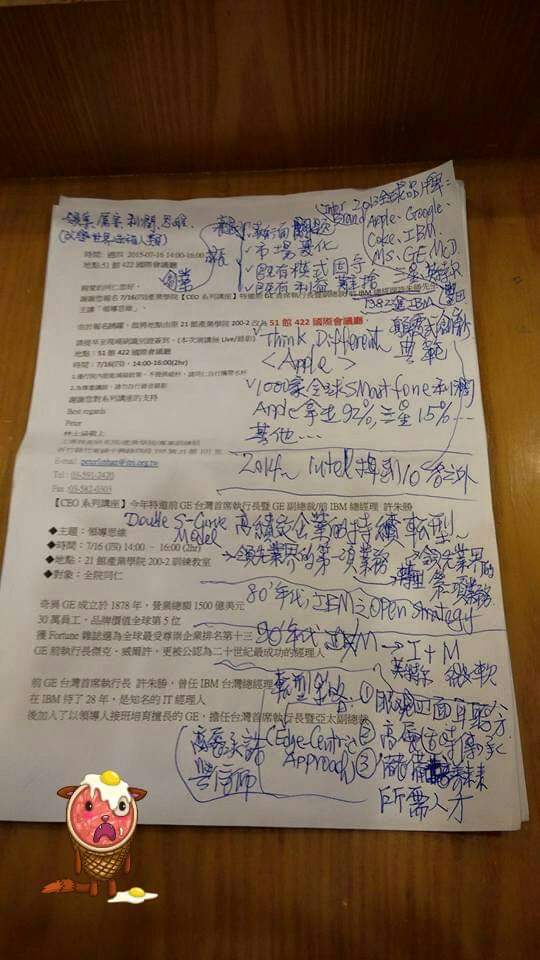2015.07.17 在院部聽前IBM 總經理 許朱勝『領導思維』演講,到下午四點… 2014年起著名悠久企業的衰退四主因:執行面問題、市場變化、既有模式固守、既有利益難捨。
