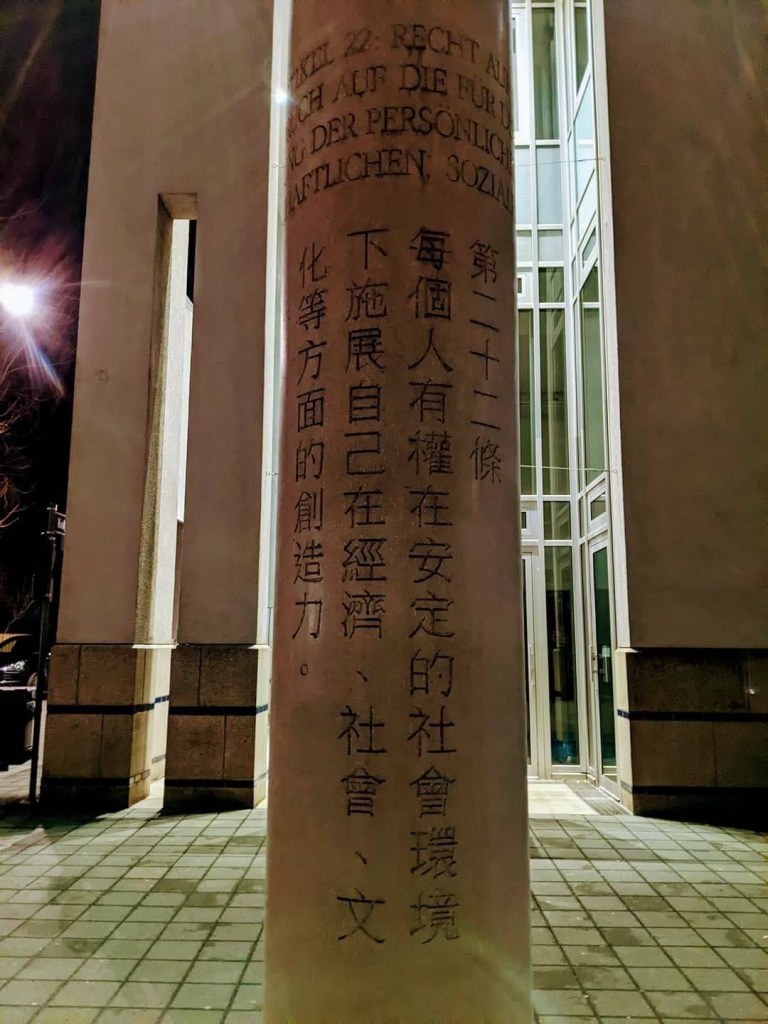 「每個人有權利在安定的社會環境下施展自己在經濟、社會、文化等方面的創造力」(德國基本法第22 條,刻在紐倫堡舊城區的博物館廊柱上)(如下圖)