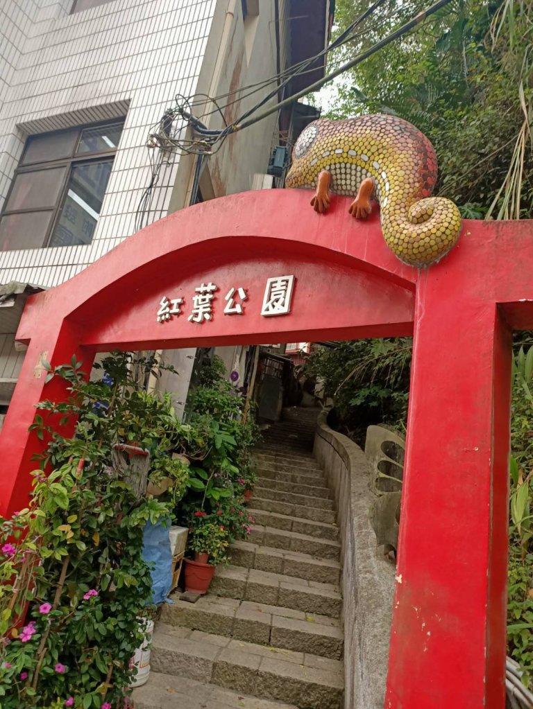 遊關仔嶺的第二天,一大早,先去爬紅葉公園,拾階而上,雖然微汗,有些氣喘,但清風徐來,甚是暢快。來到山上公園處,滿山翠色,夾有高聳檳榔樹影。此處楓樹成林,並植有專供蝴蝶享用之蜜源花樹數種,想像秋天的關仔嶺,滿山遍野盡是楓紅層層,蝴蝶漫天亂舞的佳節,期待吧!