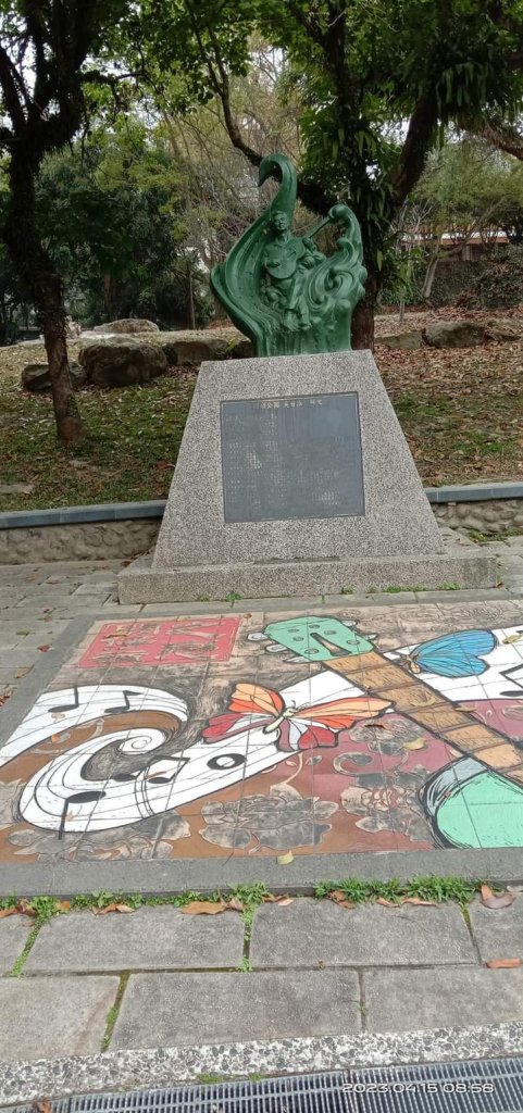 公園廣裡有一尊吳晉淮先生紀念碑塑以及兩個磚刻圖像。吳晉淮胸懷吉他,翹起左腳,一副悠遊自得,信心滿滿的瀟灑狀,似乎在內心蘊釀著,想再譜出一首新曲的模樣。