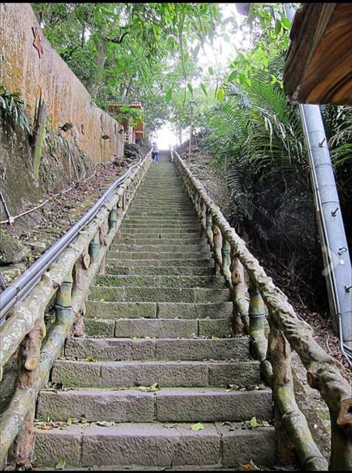 接著登上寺院後方的火泉步道,此步道可通往枕頭山頭及水火洞。步道曲徑通幽,綠蔭遮天,頗有「遠上寒山石徑斜」的古味,午後太陽仍然艷熾,穿過林梢的葉影,映照在土階上,風起影移,饒富有趣。這時鳥兒在樹陰處鳴叫,聽得出來是竹雞、五色鳥及白頭翁的叫聲。