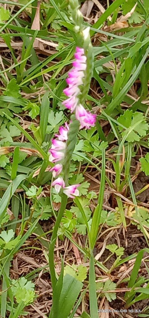 我於4月中旬在母校政治大學某處發現難得一見的綬草好幾叢,令我驚喜萬分,這是多年來在他處尋尋覓覓不可得的結果。看那盈盈盤沿而上的花姿,與身旁雜草相比,像鶴立雞群般,巍峨挺拔,有如寺廟前殿外面附著在兩根石柱的龍身,蜷蜿而上。成串花朵隨風搖曳,令人驚豔。