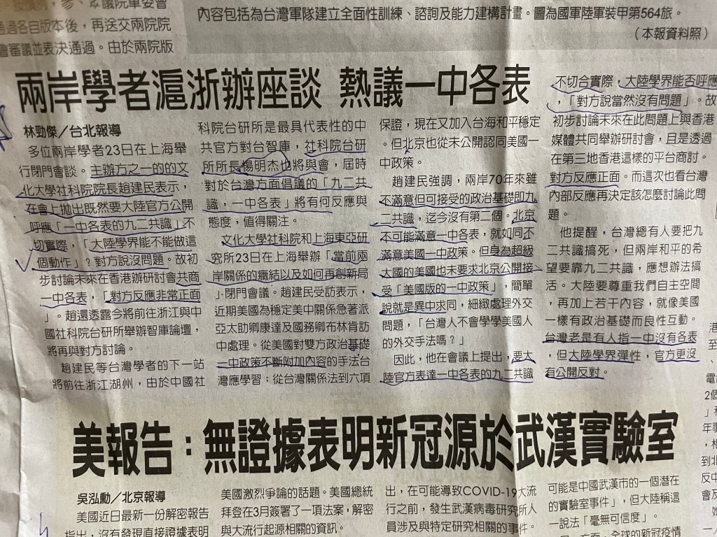 2023 年6 月25 日「中國時報」之「旺報」版有一篇報導「兩岸學者滬浙辦座談熱議一中各表」,引起呂律師的注意: