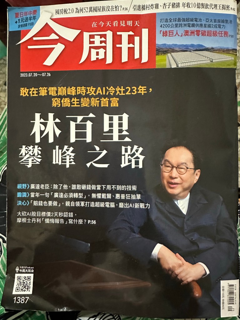 林百里先生1949 年出生於上海,遷香港,之後以僑生身份入學台灣大學電機系(通常有優惠),他因「成績不甚佳」未去美國留學,畢業後和溫世仁、梁次震先後任職三愛電子公司、金寶電子公司,而於1989年和梁次震創業廣達公司,做筆記型電腦,成為筆電一哥,並約在2000 年投資上海廠,然而林百里並不以此為滿足,又持續精研、投資雲端及AI,於2023 年股價大幅上漲至260 元台幣(8 月1 日跌至237 元、8 月2 日收盤價跌停至213.5 元)股票市值曾破一兆元台幣以上,成為台灣第四大(台積電、鴻海、聯發科之後,但7 月31 日、8 月1 日、2 日因股價下跌,被台達電超車),其個人資產達2900 億台幣,被「今周刊」報導變成2023 年的台灣新首富,封面稱之為「窮僑生變成新首富」。實在了不起。他40 年持續創新、堅持,投入「當時還不賺錢、仍用不到的AI , 常常創造「社會瀑差價值」,於2023 年隨著AI 的爆發,成為台灣新首富,可以說是創業、努力在一個好的時代,經歷過IT 、雲端、AI 不同世代及社會,而享有高度的「社會瀑差價值」,也為台灣、中華大地、東亞、世界及其股東創造了甚多工作機會、稅收及財富。 中國於1999-2003 年取消了五千年來的「農業稅」(台灣更早也是),村村有道路,處處有高速、高鐵(動車),由「農業哺工業」轉變成「工業反哺農業」,是歷史性的大事,是「社會瀑差價值」的大成果,人人可以簽合同、做交易,中國於2020 年公佈民法典,國家保護合同(交易)自由及私有財產,國民生產總值由2002 年為美國的百分之13 提升到超過美國的百分之七十以上,成果非凡。 這皆拜世界尤其是東亞和平發展機遇及「召商引資」、「不折騰」等等好的政策之𧶽,當動心忍性維持和平的格局,持續繼續長期發展!希望林百里先生「們」能繼續在兩岸、東亞及世界享受和平發展繼續創造「社會瀑差價值」。1949 年他被帶離上海,1989 年在台灣創業,希望他在2023年之後不須離開台北中華,而和他一起在2016 年為輝達創造出第一台「AI超級電腦」的黃仁勳則於9 歲時離開台灣,誠為唐君毅先生「說中華民族之花果飄零」書中的𨒂長一幕,到2023年以後還不能停止嗎?我總覺得: 戰爭是互不連動的農業時代的事,而世界連動頻繁的工商業時代尤其網路、雲端、AI 時代不應再有戰爭而互殘。是耶?非耶?