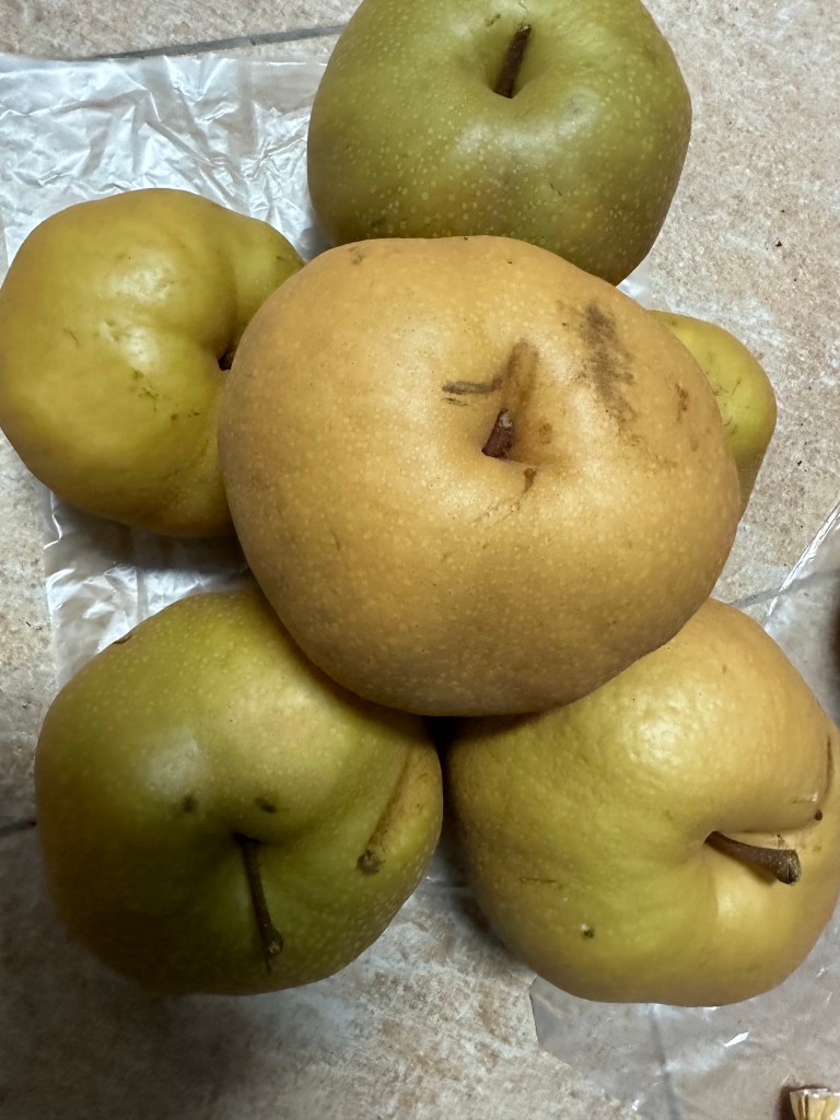 2023 年八月11 日下午我和俊鵬、文東夫婦(北軍)、陳清林、黃聰文(南軍,溪州北上)會合於卓蘭,到詹德明董事長經營的梨園採摘寶𡷊甘露梨,梨又大又甜,感覺幸福啊,哈。該甘露梨有「植物品種權」,這梨園經授權合法種植。請賣埸、消費者認同是否合法授權,共同維護智慧財產權。想得到合法授權種植、販賣的可找景茂農企業公司(02-25528919 郭董、薛助理)辦理授權。