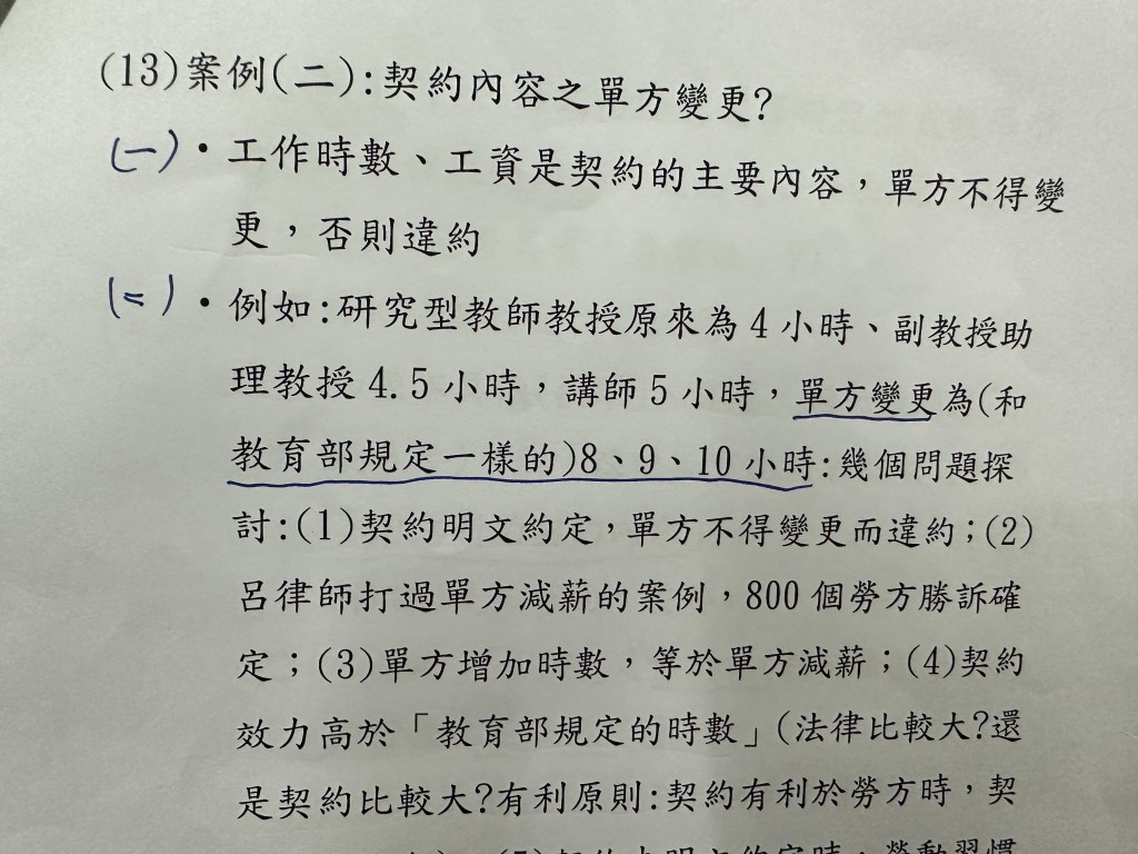此次回應具體問題及準備,奠基於我的博士論文「勞動法法源及其通用關係的研究」(真的,歡迎去台大圖書館查閱),分析憲法、協約、契約、法律、教育部規定、學校的規章、習慣、指揮權命令之間的法源地位及其間的位階關係(位階原則)及「有利原則」法理的運用!還好當年認真寫了論文,才有基礎。真所謂「台上十分鐘,台下十年功」。